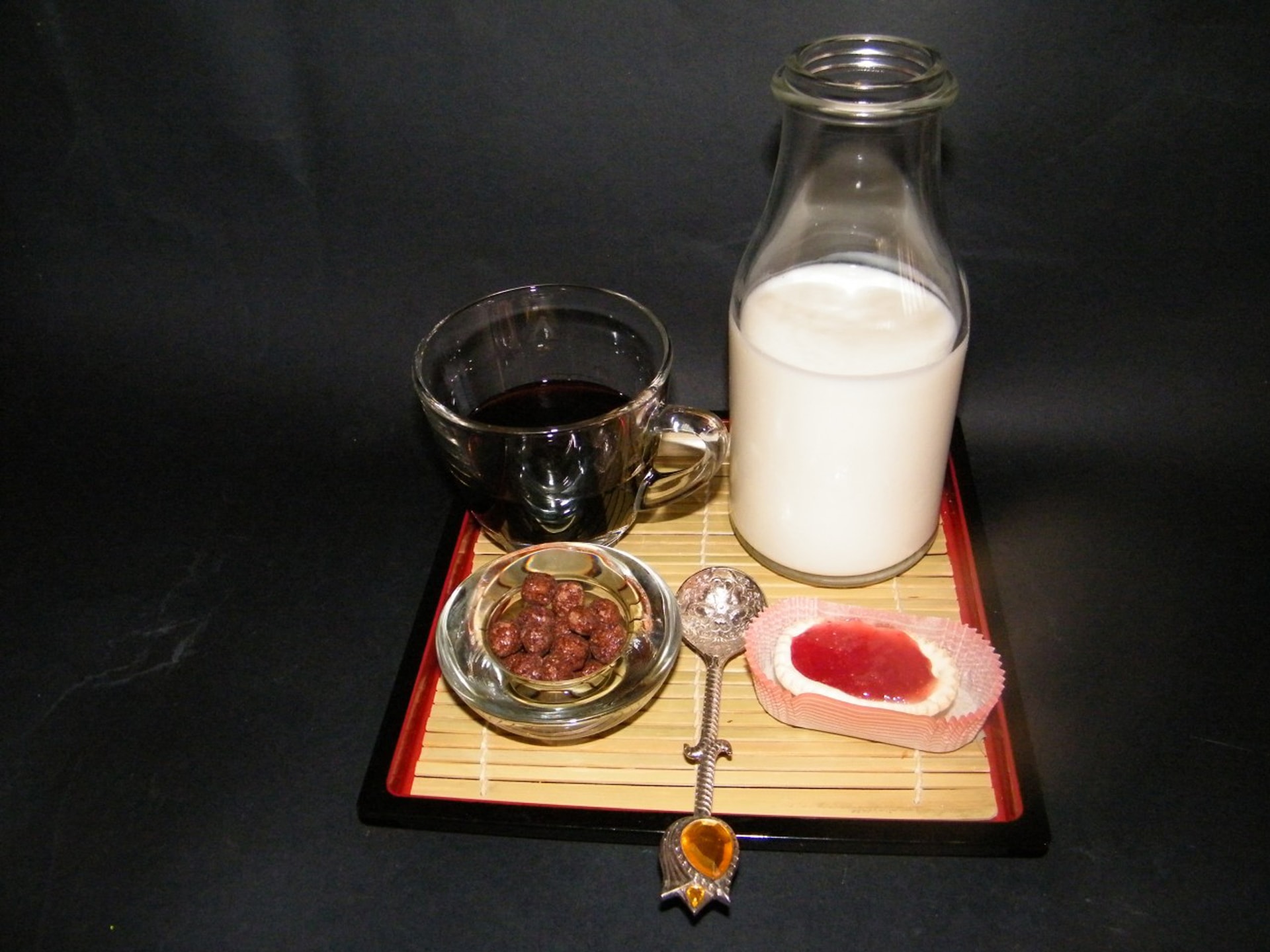 A parte doteremo questa insolita colazione con cereali al cioccolato e Rum più una tartelletta alcolica alla confettura di fragola.